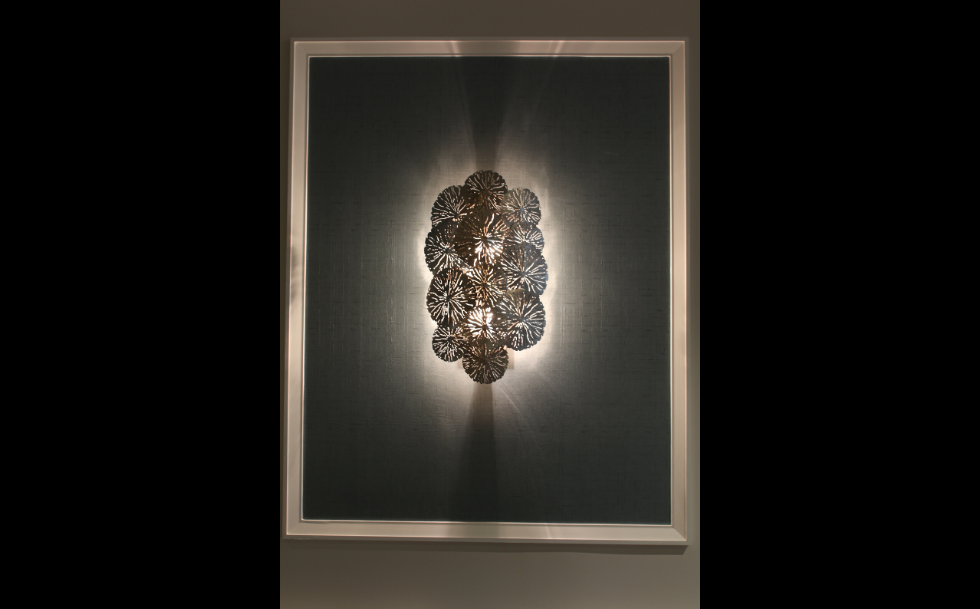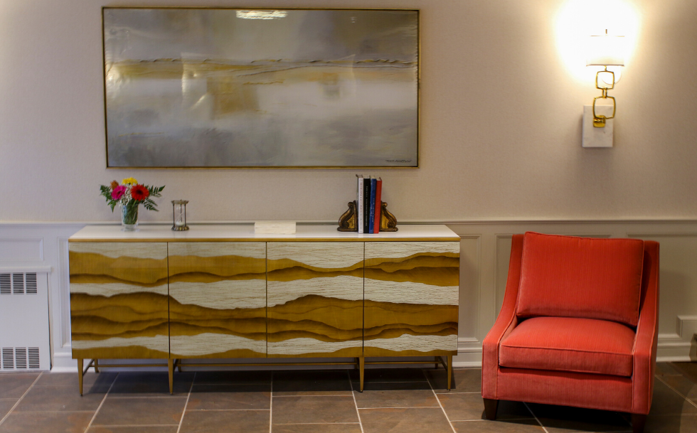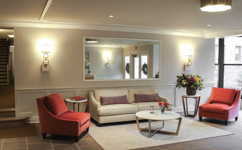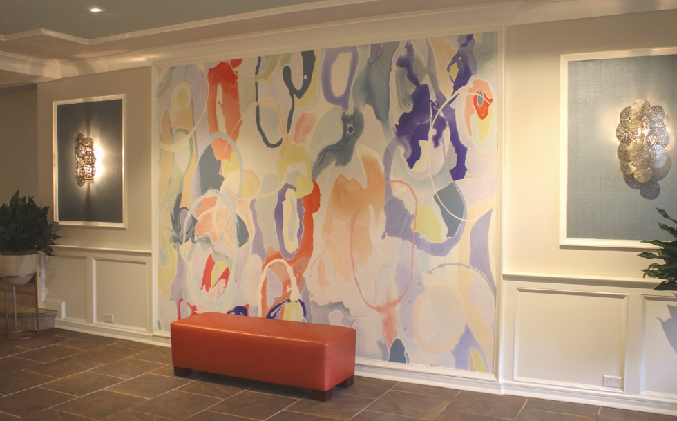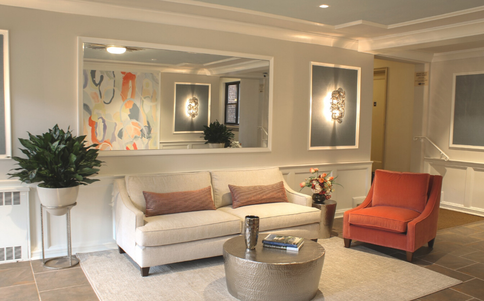 Nestled in a tree lined block on the urban streets of Great Neck lies a private complex of residential apartments. At Habitech, we believe the first impression of a building's lobby should give tenants a comforting "welcome home" feeling. Carefully detailed moldings and coverings accentuate the walls and ceilings. "Days In Between" digital art mural with vibrant orange, jade, colors combined with exceptional lighting and hammered metal furnishings compete the design.