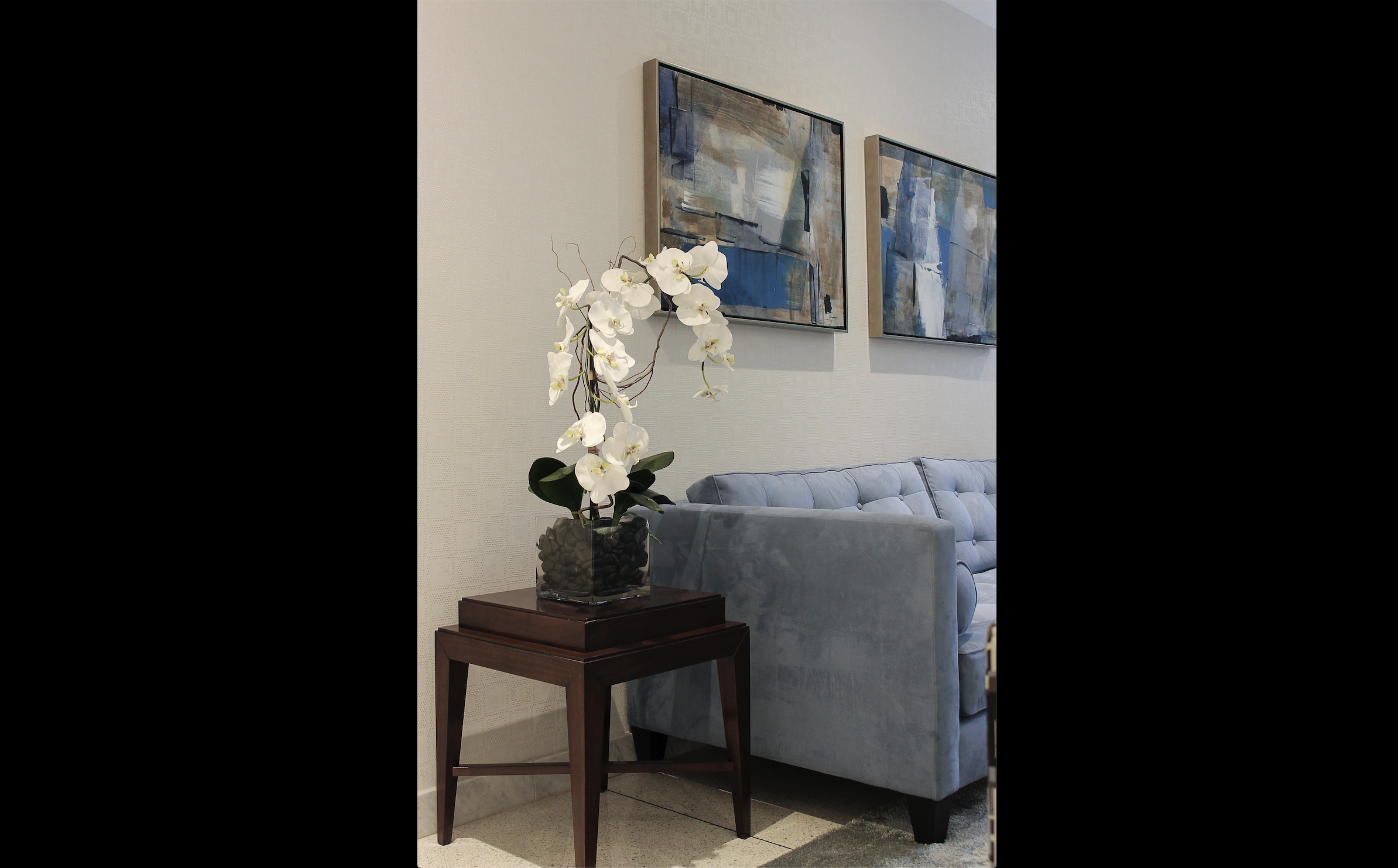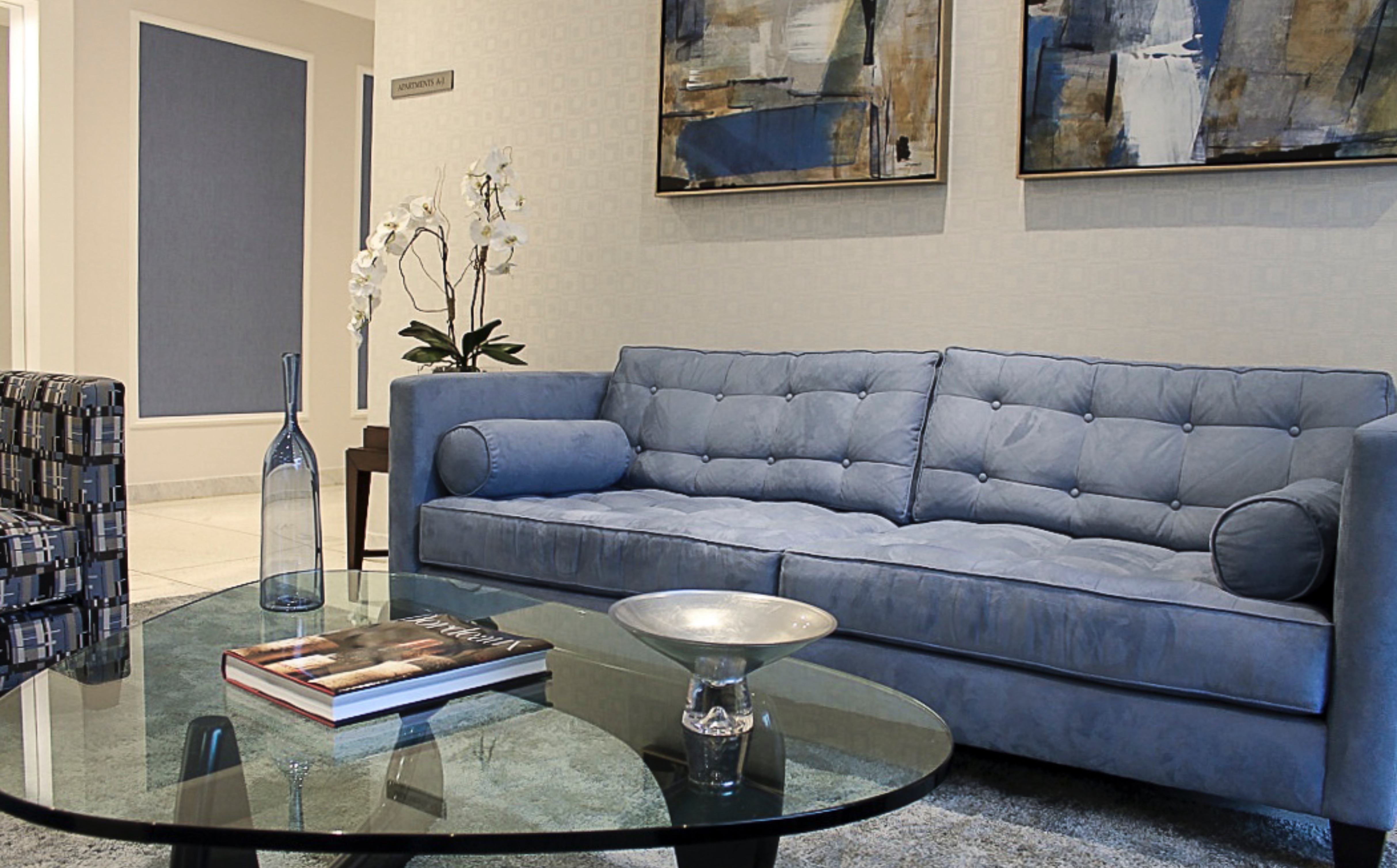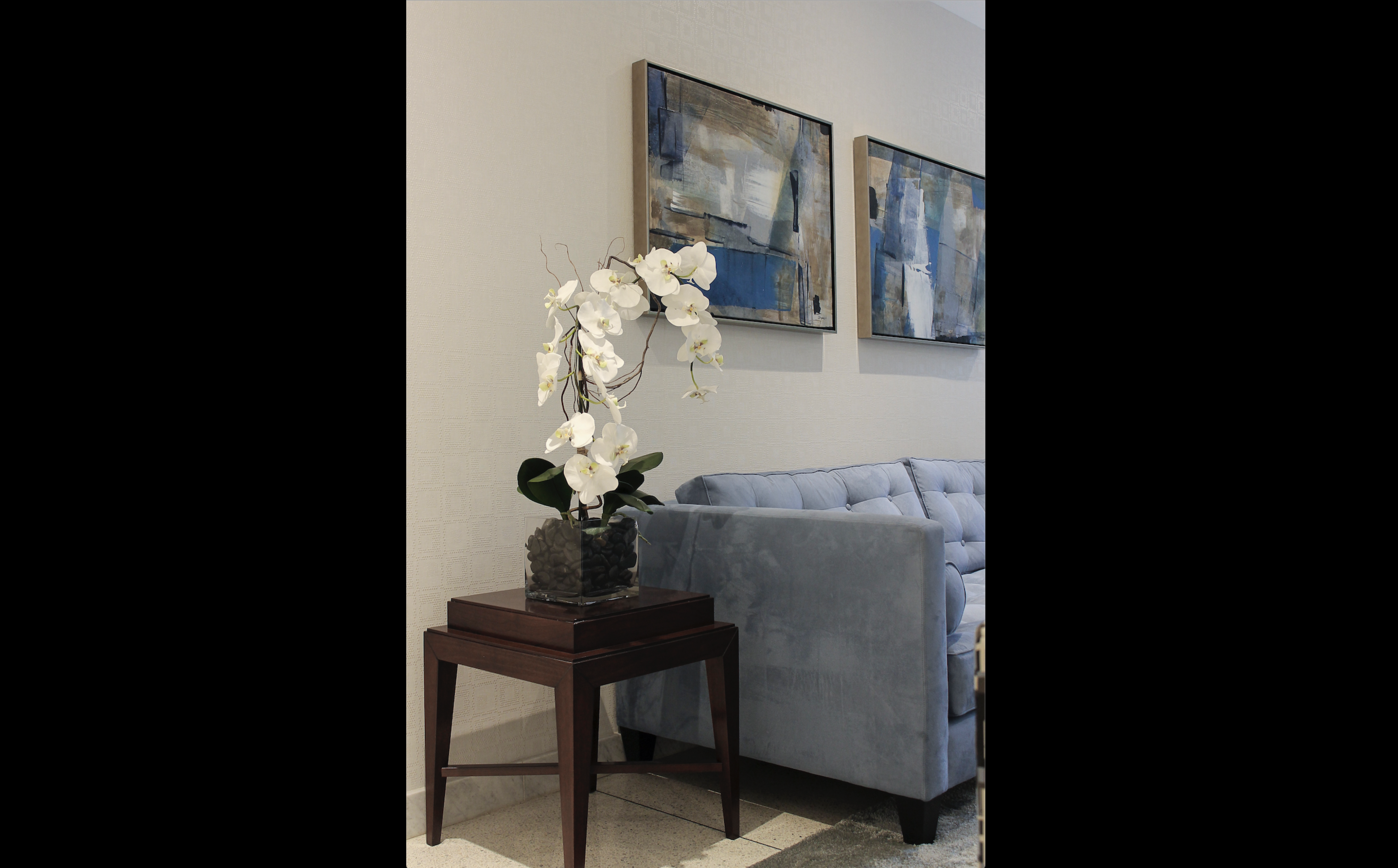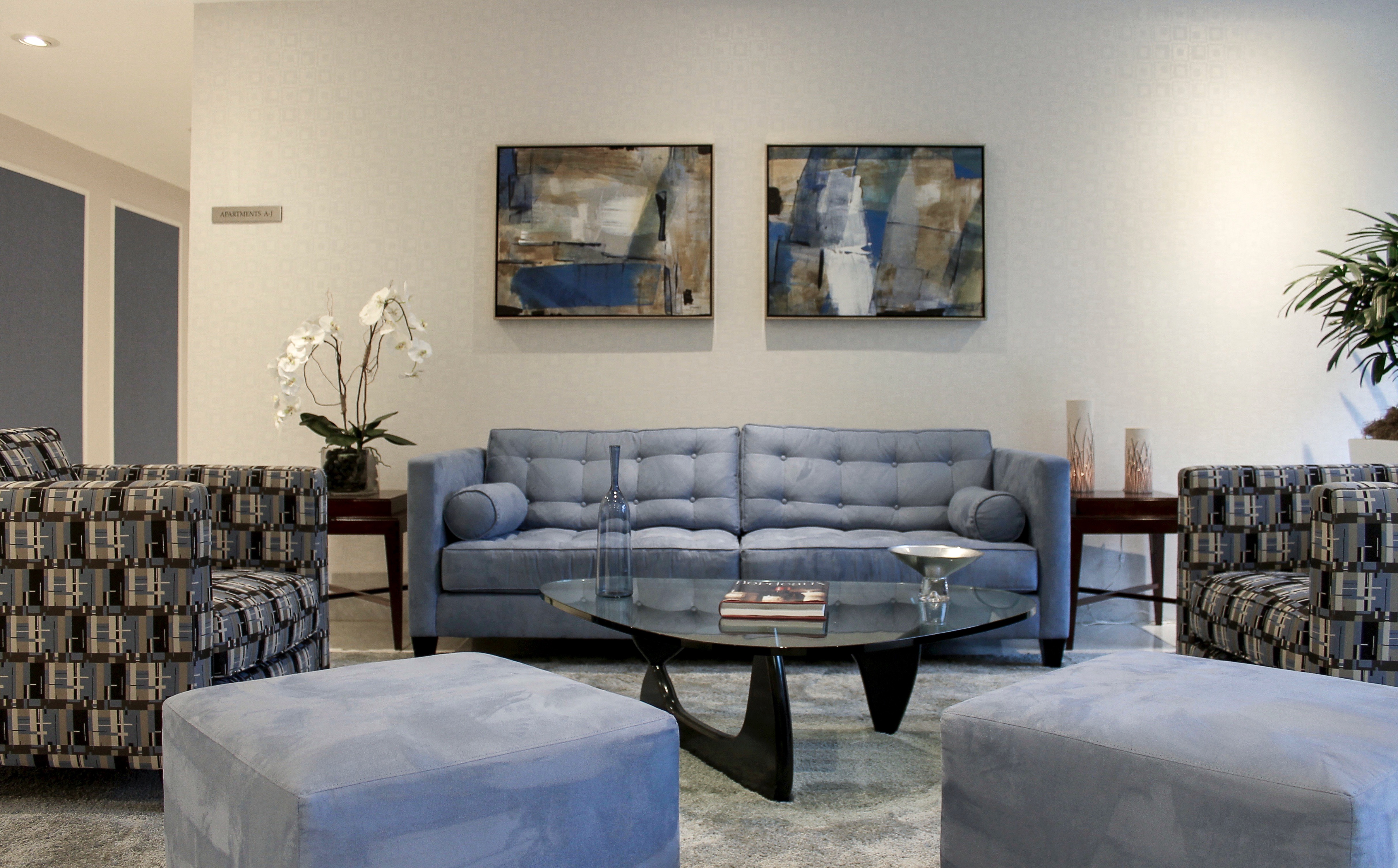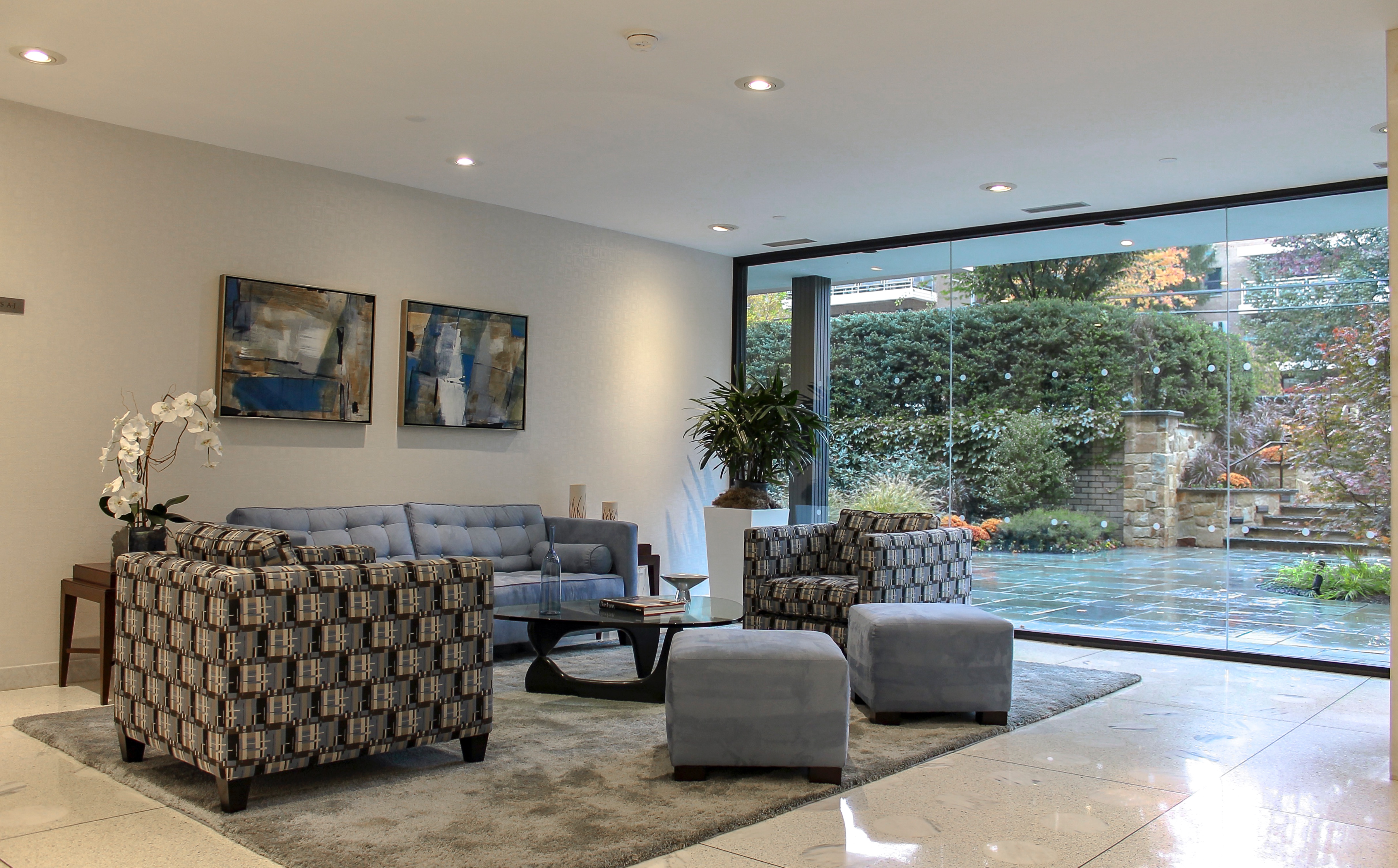 A statement garden design and a beautifully detailed stone stairway leads you to a private mid-century residential apartment. The greatest design challenge for this lobby renovation was to create an updated image that incorporated the building's original marble floors, walls and low ceilings. Period Knoll sofas and a classic Noguchi table pays tribute to the mid-century style while new modular 3D panels offer a feature wall with visual movement and excitement. The full height exterior glass wall visually brings the four season garden indoors all year round.