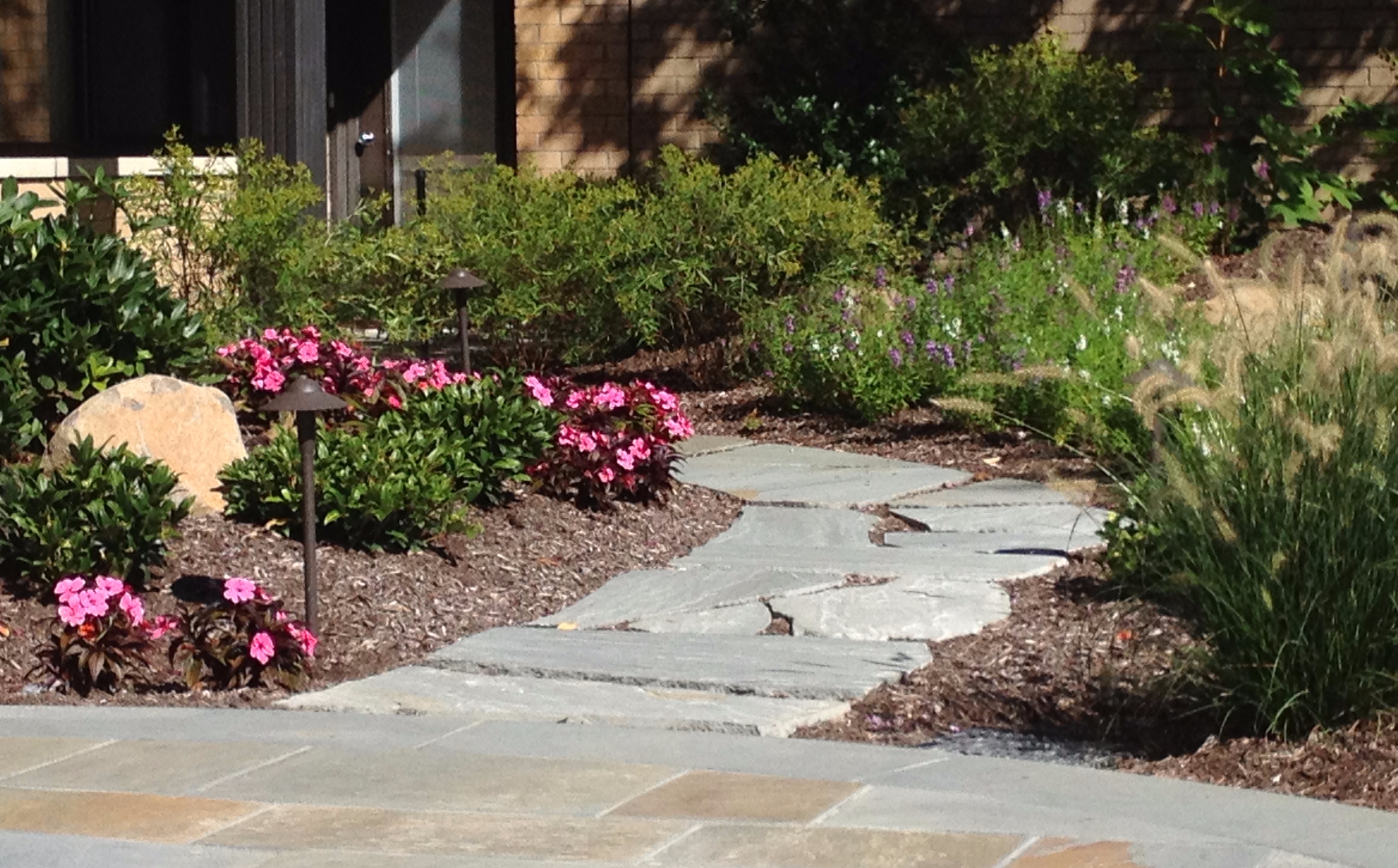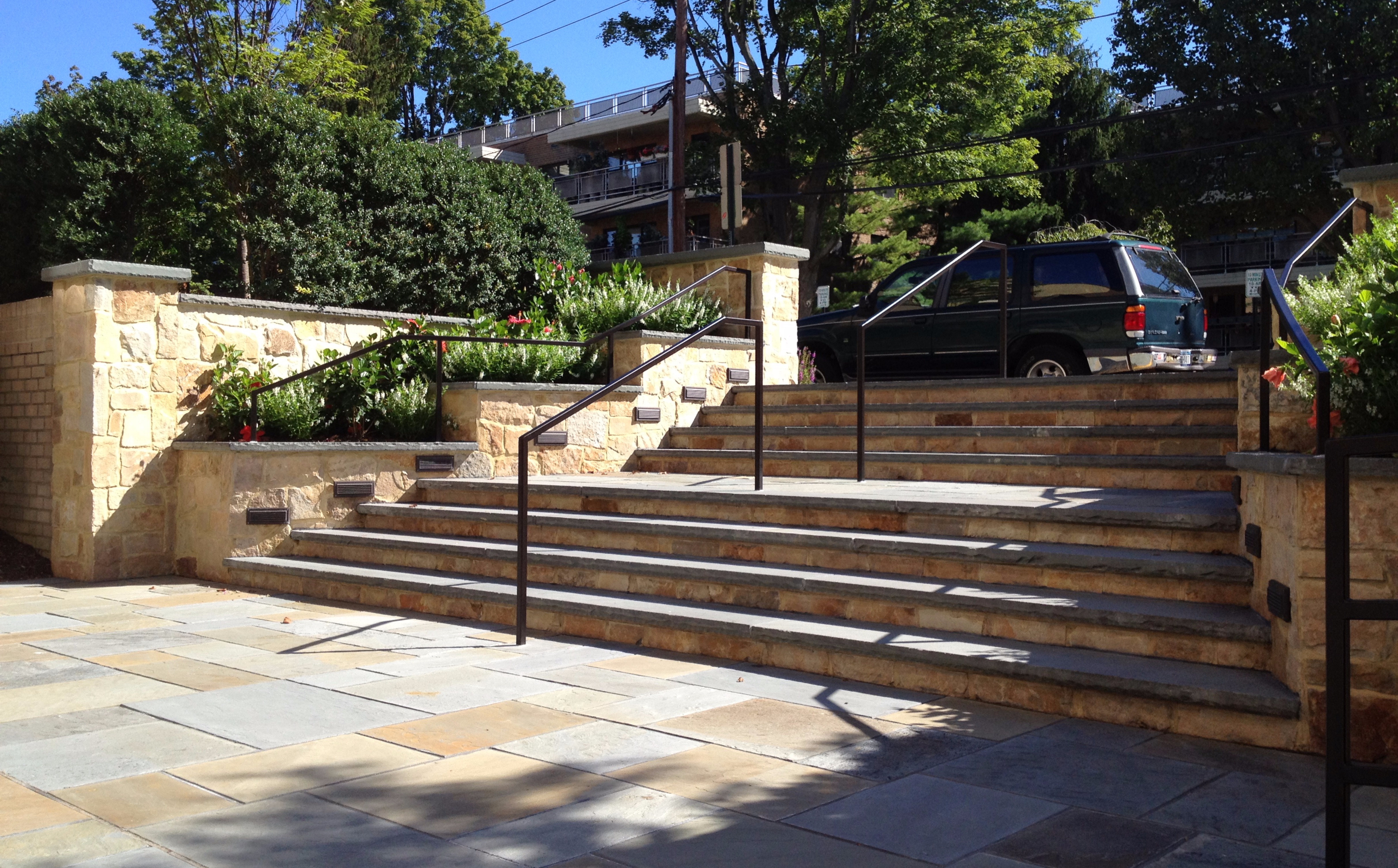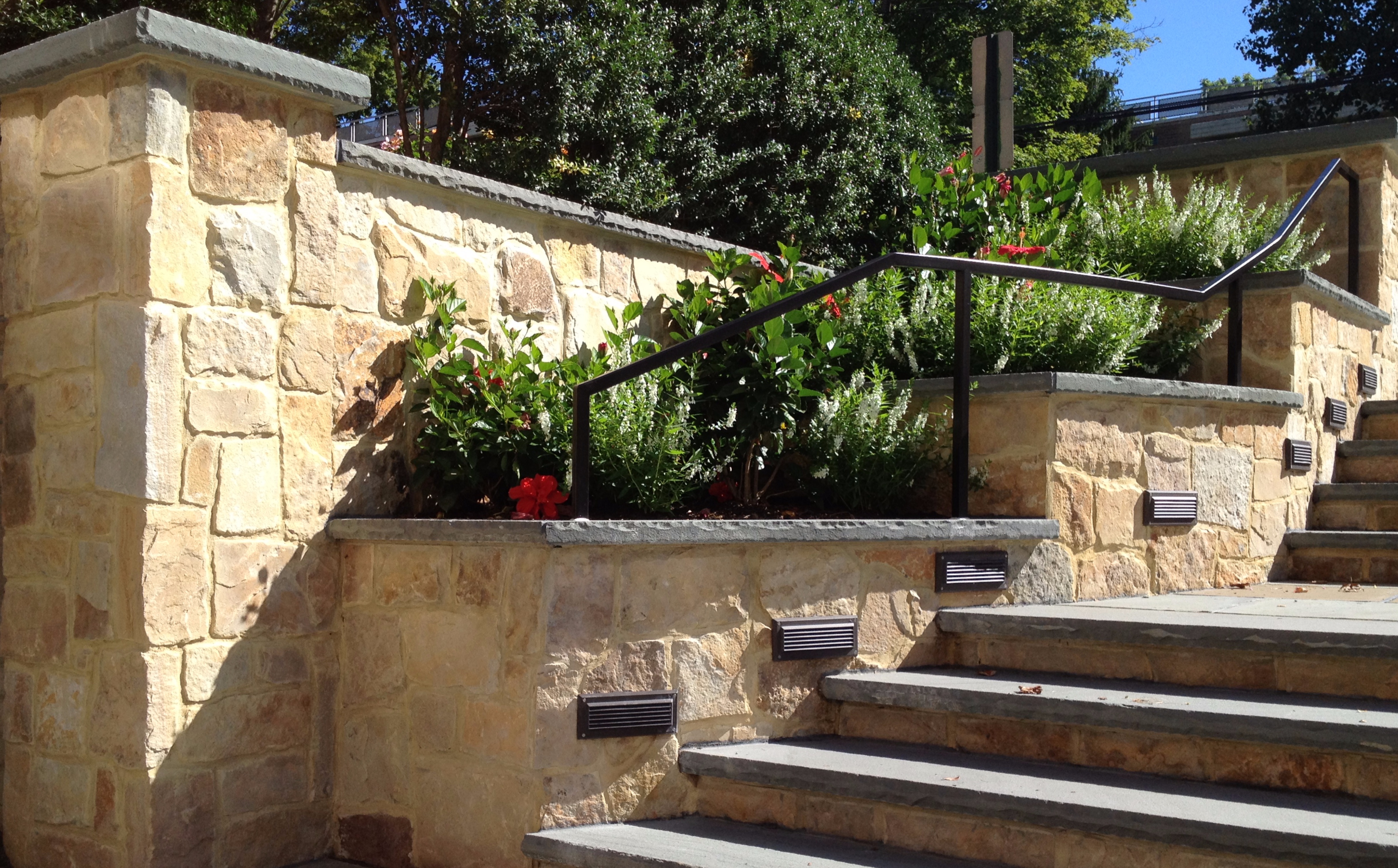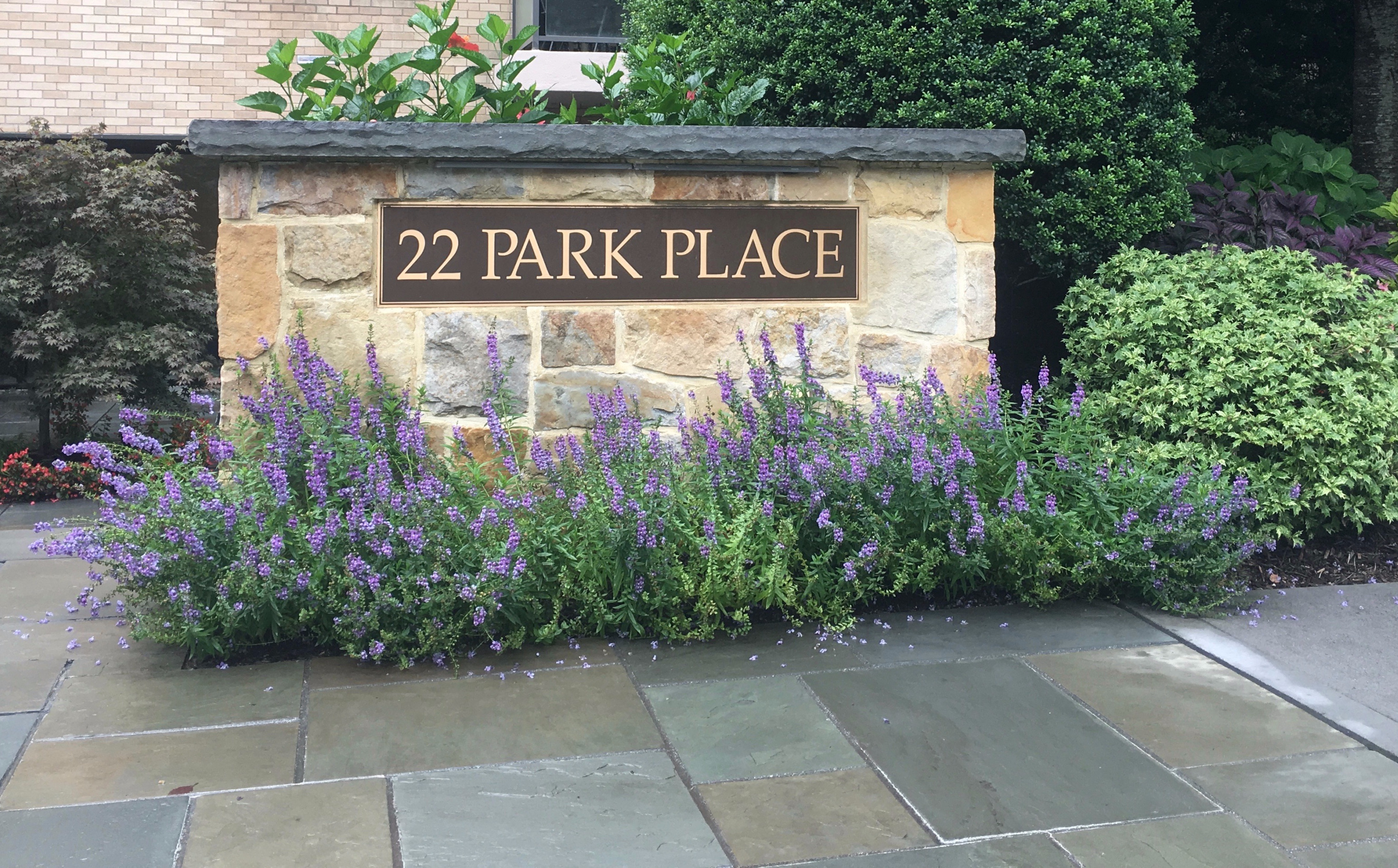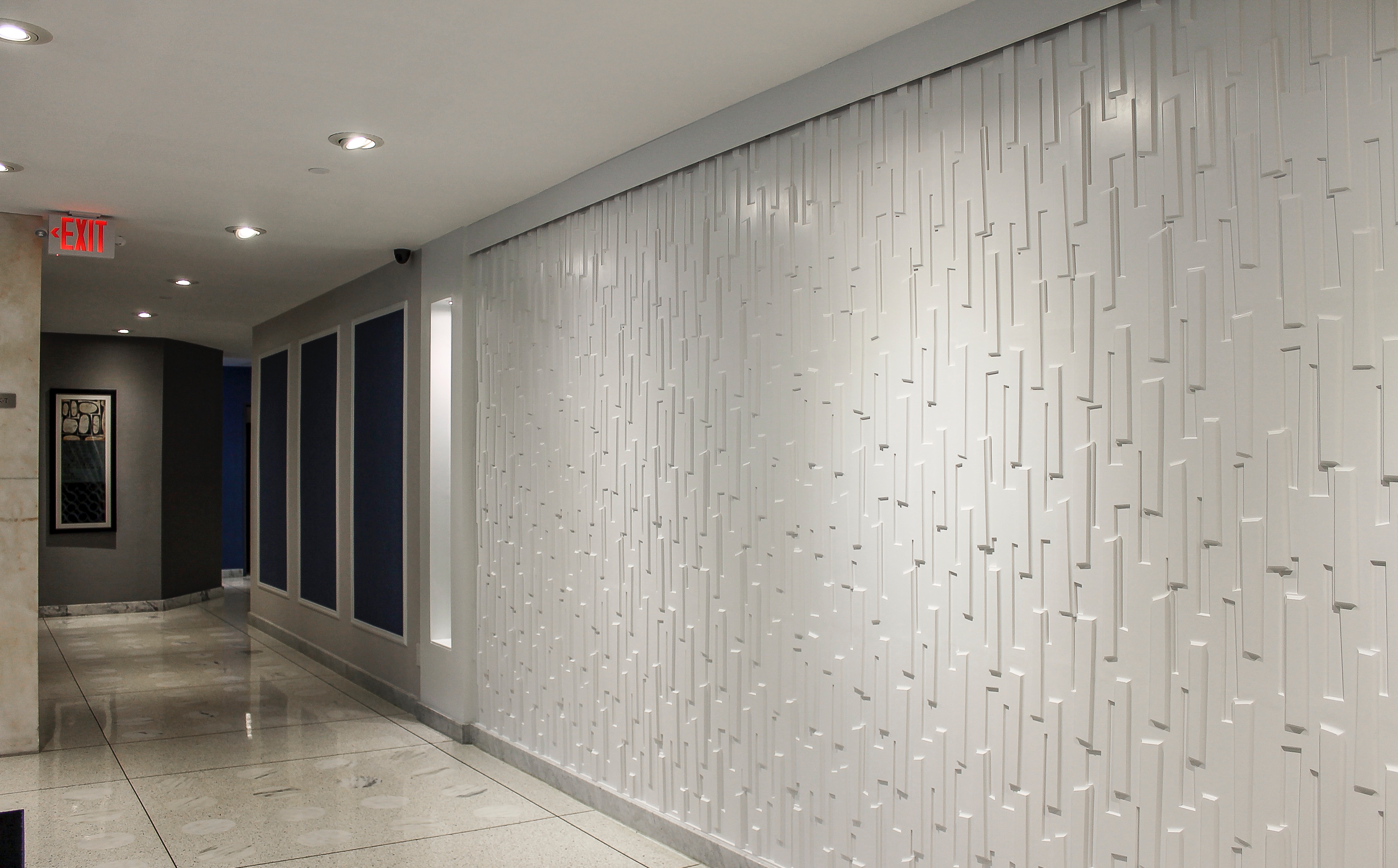 A statement garden design and a beautifully detailed stone stairway leads you to a private mid-century residential apartment. The greatest design challenge for this lobby renovation was to create an updated image that incorporated the building's original marble floors, walls and low ceilings. Period Knoll sofas and a classic Noguchi table pays tribute to the mid-century style while new modular 3D panels offer a feature wall with visual movement and excitement. The full height exterior glass wall visually brings the four season garden indoors all year round.