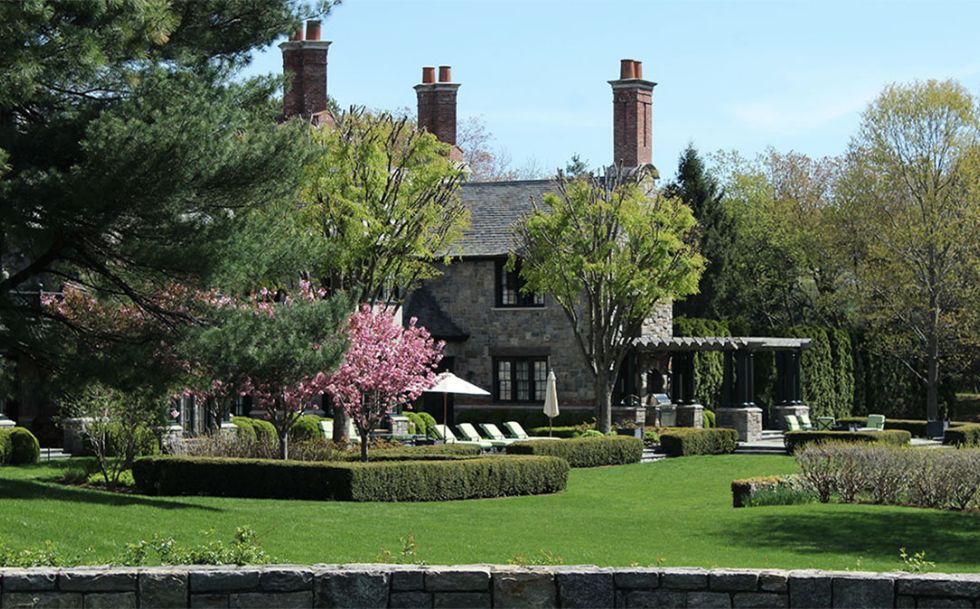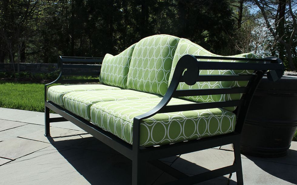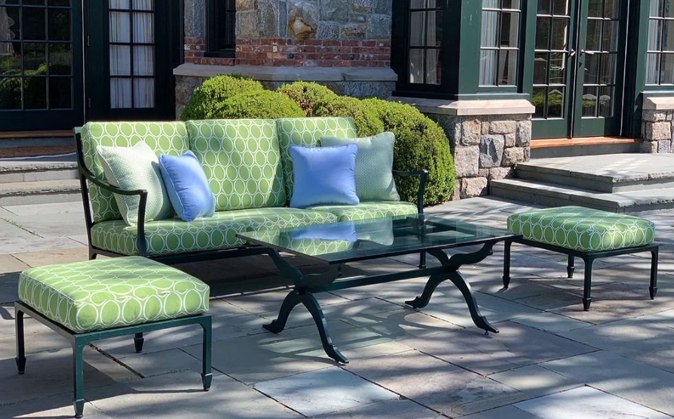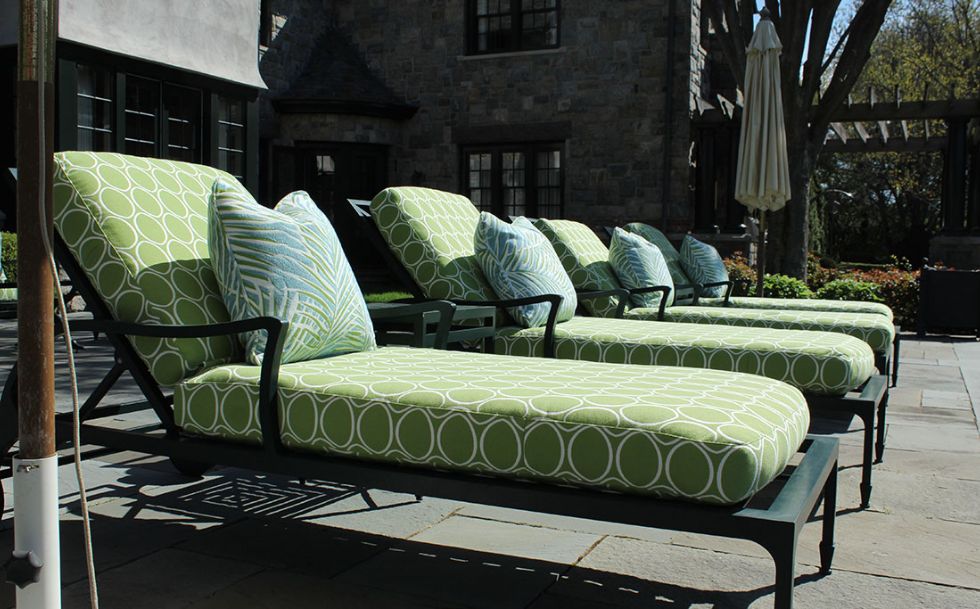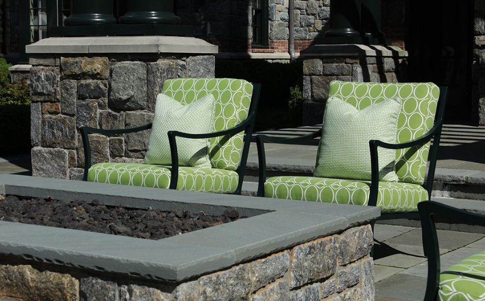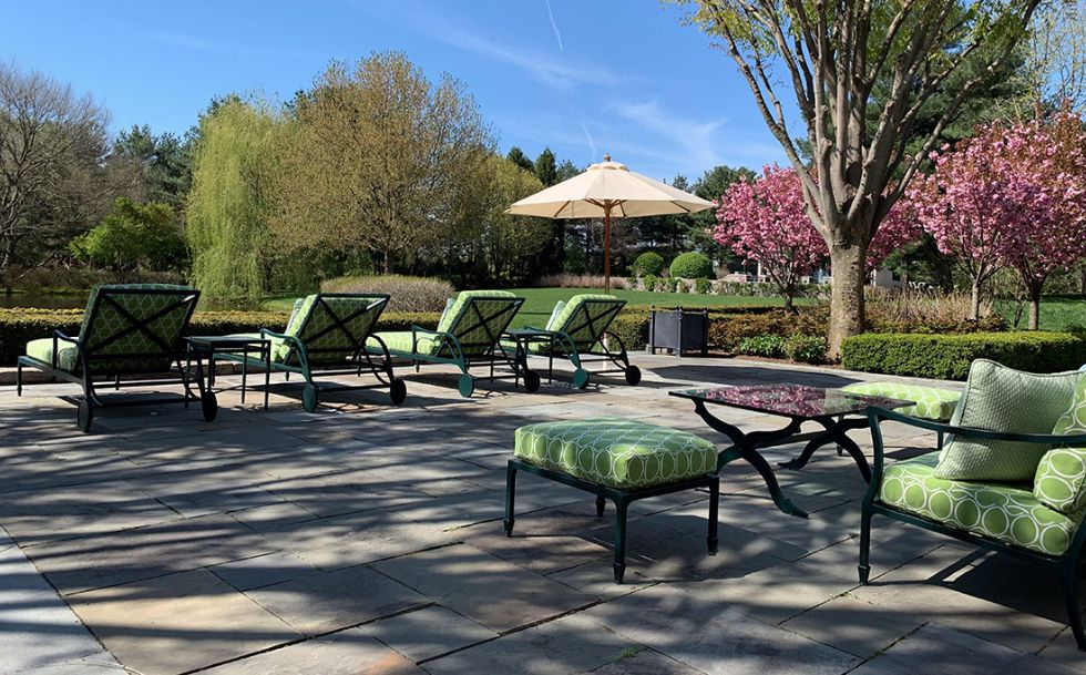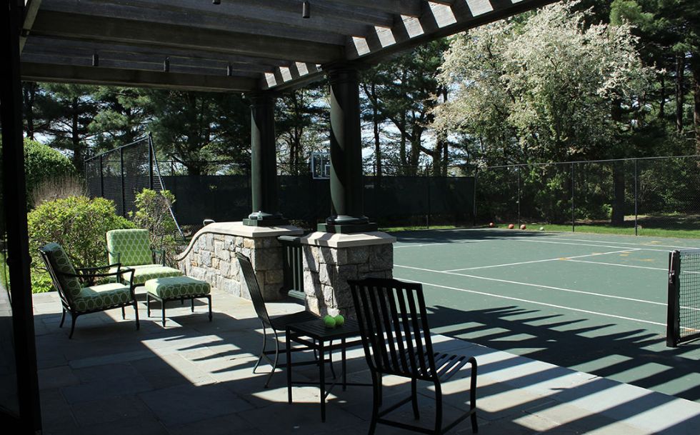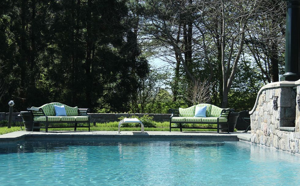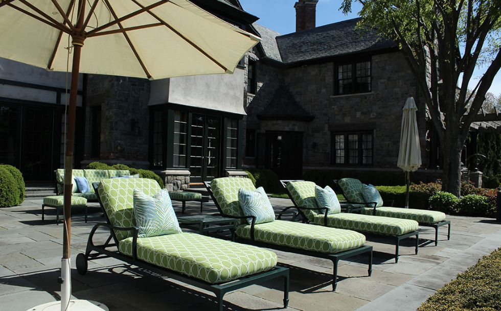 Behind the hedges lies a tranquil manicured estate classically designed by Architects, Shope, Reno, Warton. The outdoor gardens are a stunning horticultural delight. We designed the outdoor furnishing areas throughout the estate. Selecting a natural palette of bright greens, soft blues and stone colored fabrics and finishes to complement the classic estate, gardens, pool and tennis house.