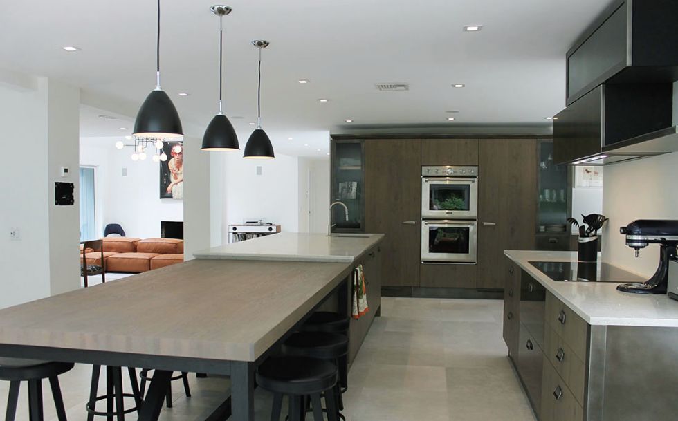 - Modern kitchen design with an urban style: Scavolini cabinetry with weathered woods, distressed metals, and wire glass. 15’ Island with seating.
